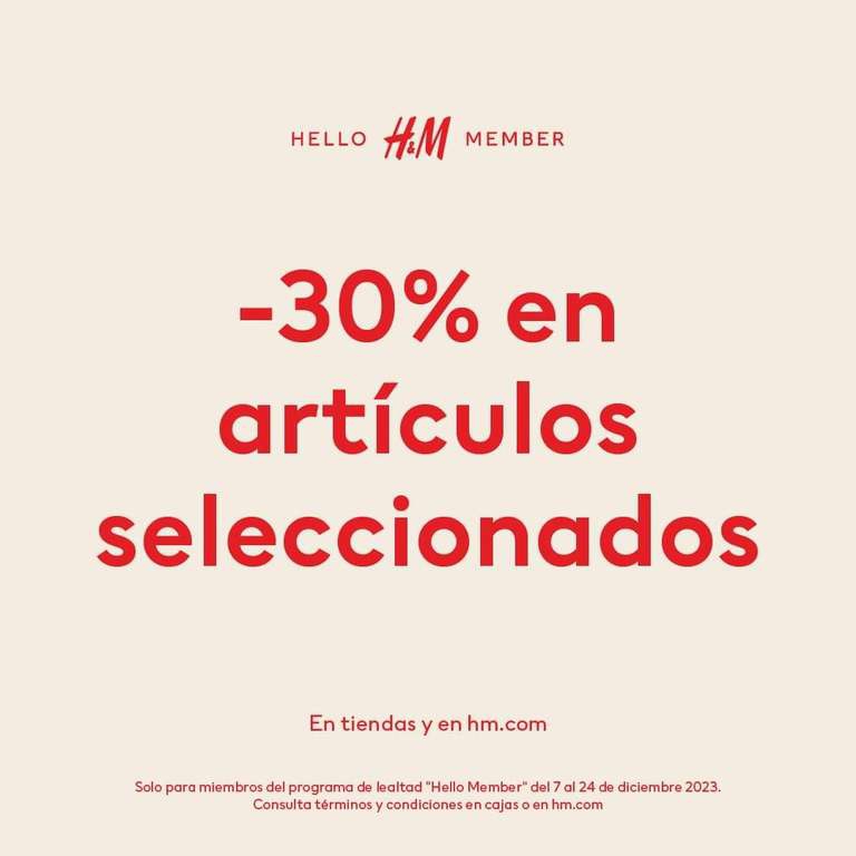 H&M Ir a la oferta>hm.com. Oferta válida en tiendas, únicamente presentando en caja el producto, para su compra, con etiqueta del 30% para miembros. Esta oferta no es combinable con otras promociones y/o descuentos. No aplican cambios ni ajustes en compras anteriores a la vigencia de la oferta. Esta oferta está sujeta a cambios sin previo aviso.