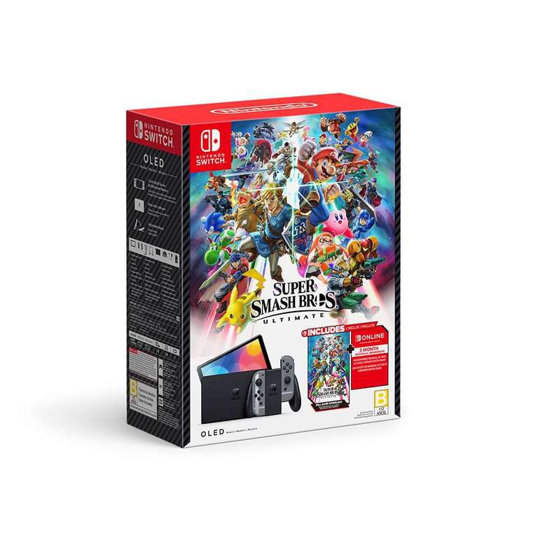 HEB Ir a la ofertaDisfruta de estupendos combates con Mario y sus amigos Este paquete contiene todo lo que necesitas para disfrutar de grandes batallas con Nintendo Switch™, incluida una consola Nintendo Switch, modelo OLED y un par de controladores Joy-Con™ con un diseño inspirado en el juego Super Smash Bros.™ Ultimate. Además, podrás disfrutar de un valor añadido con un código de descarga para el juego Super Smash Bros. Ultimate y una suscripción individual de 3 meses a Nintendo Switch Online**. Puedes iniciar competencias multijugador en cuanto abras la caja; solo comparte un control Joy-Con con un amigo para jugar juntos en la misma consola. O comparte más controles (se venden por separado) y diviértete con hasta 8 jugadores en la misma consola. ¡El juego de Super Smash Bros. más grande de la historia! Combate como icónicos personajes de los videojuegos y ¡saca a tus oponentes del escenario en batallas llenas de diversión donde cualquier cosa puede ocurrir! Todos los combatientes de títulos anteriores de la serie Super Smash Bros. se unen al elenco junto con un nuevo grupo de personajes. Escoge entre una lista de 74 combatientes, incluyendo personajes populares como Mario, la princesa Peach, Link, la princesa Zelda, Pikachu, Duck Hunt, Pac-Man y otros que han hecho parte de la historia de los videojuegos.