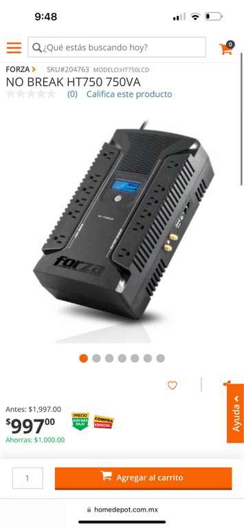 Home Depot Ir a la ofertaMe parece un excelente precio tiene aprox 50% de descuento, comparado con los demás no breaks está a precio de regalado, tiene algunas funciones extra, desde mi punto de vista vale mucho la pena tan solo por el número de contactos que tiene solo en la función de regulador para proteger los equipos electrónicos