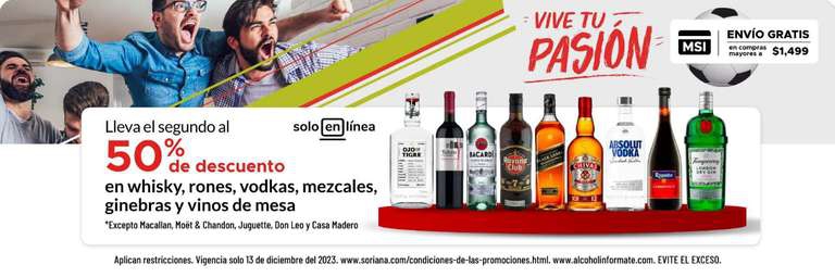 En whiskys, rones, vodkas, mezcales, ginebras y vinos de mesa, compra uno y llévate el segundo a mitad de precio.