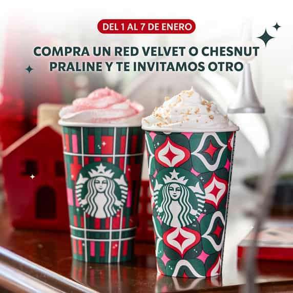 Starbucks Ir a la ofertaEn la compra de una bebida grande (400mL) o venti (500mL), obtén otra gratis comprando en tienda o por Starbucks Rewards Pickup (Recoge en tienda), Car Pickup (Recibe en tu auto) y Starbucks Rewards Delivery (Entrega a domicilio).