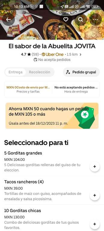 Uber eats el sabor de la abuelita JOVITA (DURANGO) ahorra $50 cuando hagas un pedido de $105 o mas | envio gratis con one
