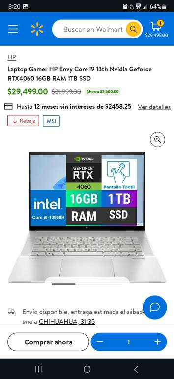 Walmart Ir a la ofertaLaptop Gamer HP Envy Core i9 13th Nvidia Geforce RTX4060 16GB RAM 1TB SSD con BBVA A 12 MSI aplicando cupon D19BBVA precio incluye envio