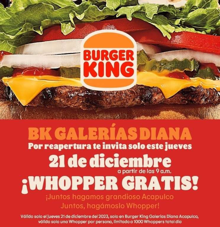 Whopper GRATIS en Burger King Galeras Diana por reapertura