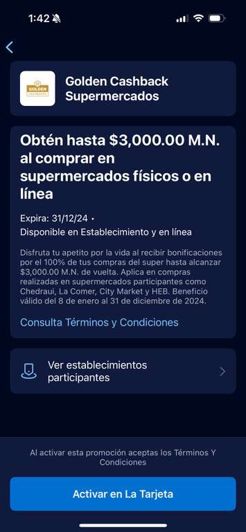 American Express Ir a la ofertaYa está para poder activar el golden cashback en supermercados.