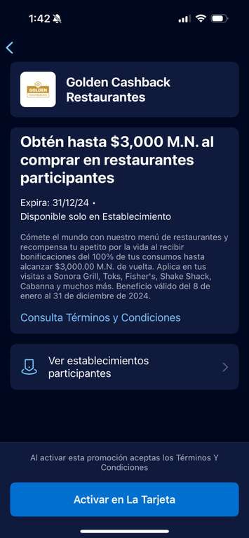 American Express Ir a la ofertaYa está para poder activar el golden cashback en restaurantes.