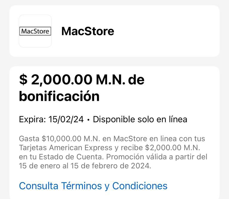 Para ser elegible a la bonificación de $2,000.00 M.N. en el Estado de Cuenta de La Tarjeta, se deberán acumular $10,000.00 M.N. de compra en Mac Store México, (www.macstoreonline.com.mx) durante el periodo de la promoción. Limitado a un total de una bonificación por Tarjetahabiente titular, el gasto en Tarjetas suplementarias no aplica. Máximo monto de la bonificación de $2,000.00 M.N. por cuenta titular durante el periodo que dure la promoción. Limitado a los primeros 26,800 registros. La oferta no es válida para transacciones realizadas con Agregadores de pagos de terceros. La oferta válida solo para compras elegible realizadas en pesos mexicaos. Solo son elegibles las compras realizadas y publicadas en su cuenta durante el período de la oferta.