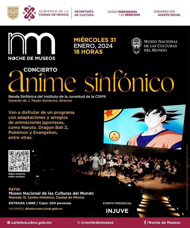 🌙En el marco de la #NochedeMuseos, se llevará a cabo el concierto sinfónico de anime a cargo de la 🎶Banda Sinfónica el próximo 📆31 de enero en el 📍Museo Nacional de las Culturas del Mundo. 👌🏻