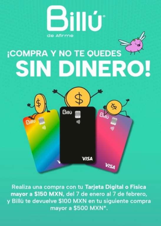 Aplican Restricciones. Vigencia del 7 de enero al 7 de febrero del 2024. Promoción válida pagando con Tarjeta de débito física o digital ligada a tu cuenta Billú en compras mayores a $150 pesos. Aplica en compras en comercios físicos y comercios digitales. Al cierre de la campaña, se validarán las compras que hayas realizado durante la vigencia de la campaña. Compras no acumulables. Bonificación no acumulable. Válido solo una bonificación por cliente y por compra durante la vigencia de la campaña. Limitado a los primeros 5,000 clientes que cumplan con los términos y condiciones. La bonificación a tu cuenta se verá reflejada en un lapso de 10 días hábiles posteriores al término de la campaña siempre y cuando realices tu segunda compra mayor a $500 pesos.