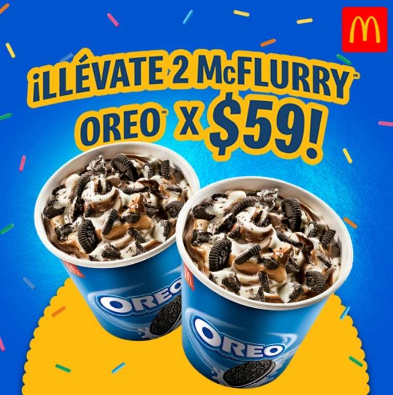 McDonald's2 McFlurry Oreo por $59 con la app de McDonald's. Válido con cupón digital generado en la app para presentar en caja y también en pedidos hechos desde la app para Pick up.