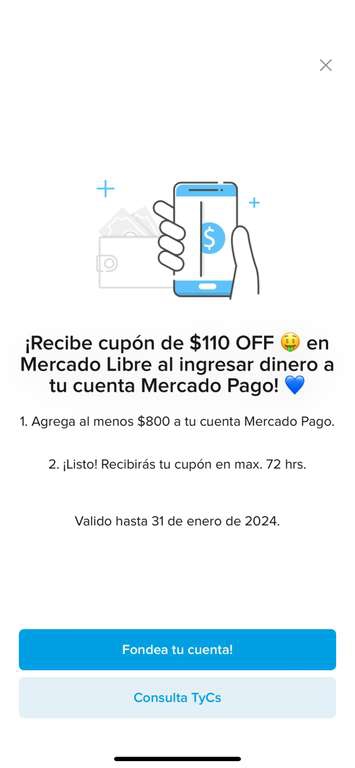 Mercado Pago: Cupón de $110 en ML al ingresar $800 en Mercado pago.