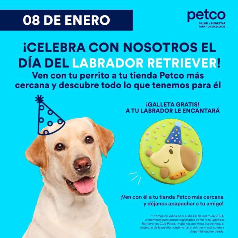 *Promociones válidas sólo el 08 de enero de 2024. La galleta no está sujeta a compra, se entrega a quienes nos visiten en tienda física en compañía de su perrito de raza Labrador Retriever, registrado en la Petco App. Al acudir con tu perrito Labrador Retriever a nuestra tienda física, podrás llevarte GRATIS el termo con número de producto 127556, hasta agotar existencias, sólo el 08 de enero de 2024.