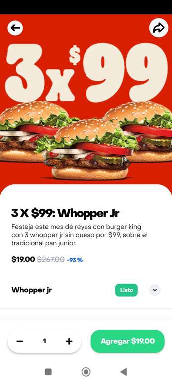 Rappi 3 whopper Jr por 19 pesos (más envío) | usuarios seleccionados
