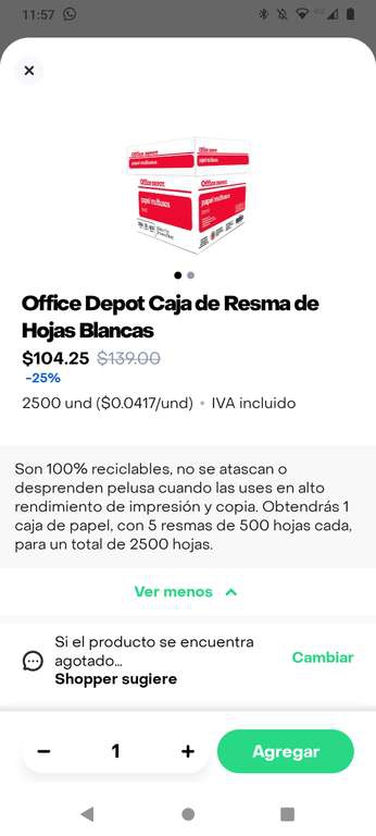 Caja con 2500 hojas blancas tamaño carta en Office Depot pidiendo por rappi