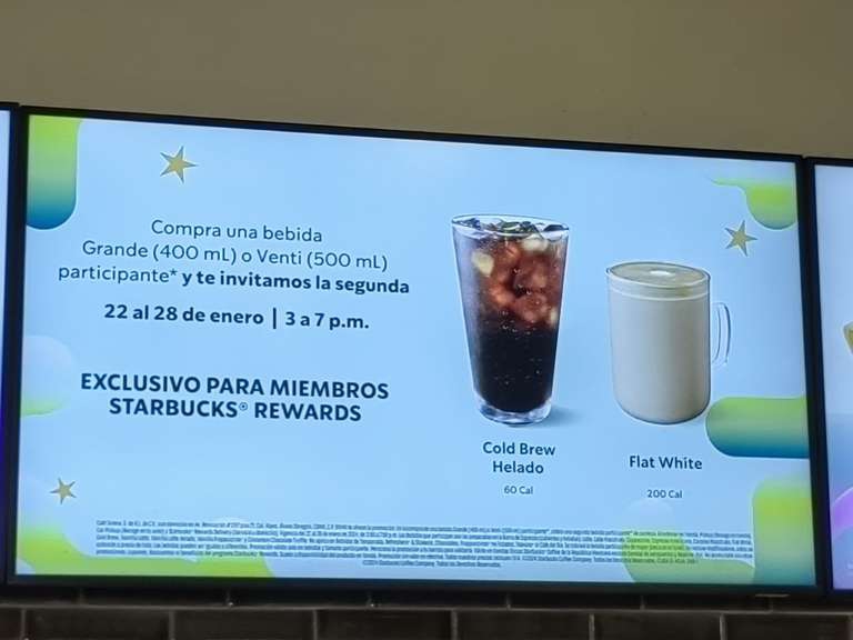 StarbucksCafé Sirena, S. de R.L. de C.V., con domicilio en Av. Revolución #1267 piso 21, Col. Alpes, Álvaro Obregón, CDMX, C.P. 01040 te ofrece la promoción: en la compra de una bebida Grande (400mL) o Venti (500mL) participante*, obtén una segunda bebida participante* de cortesía. Al ordenar en Tienda, Pick up (Recoge en tienda), Car Pick up (Recoge en tu auto) y Starbucks Rewards Delivery (Servicio a domicilio). Vigencia 22 al 28 de enero de 2024, de 3:00 a 7:00 pm. Bebidas participantes: Cinnamon Chocolate Truffle latte (caliente, helado o Frappuccino®), Vainilla Latte (caliente, helado o Frappuccino®), Vainilla Sugar Free Latte (caliente, helado o Frappuccino®), Cajeta Latte (caliente, helado o Frappuccino®) y las preparadas en la Barra de Espresso (calientes y heladas), Latte, Latte Macchiato, Cappuccino, Espresso americano, Caramel Macchiato, Flat White, Cold Brew. No aplica en Bebidas de Temporada no mencionadas, Refreshers® & Shakens, Chocolates, Frappuccinos® no listados, Teavana® ni café del día. Se cobrará la bebida participante de mayor precio en el ticket. No incluye modificadores, éstos se cobrarán a precio de lista. Las bebidas pueden ser iguales o diferentes. Promoción válida sólo en bebidas y tamaño participante. Menciona la promoción a tu barista para validarla. Válido en tiendas físicas Starbucks Coffee de la República Mexicana excepto tiendas de aeropuertos y Reserve Bar. No acumulable con otras promociones, cupones, descuentos ni beneficios del programa Starbucks Rewards. Sujeto a disponibilidad del producto en tienda. Promoción sin valor en efectivo. Todos nuestros precios incluyen IVA. ©2024 Starbucks Coffee Company. Todos los derechos reservados. CUIDA EL AGUA.