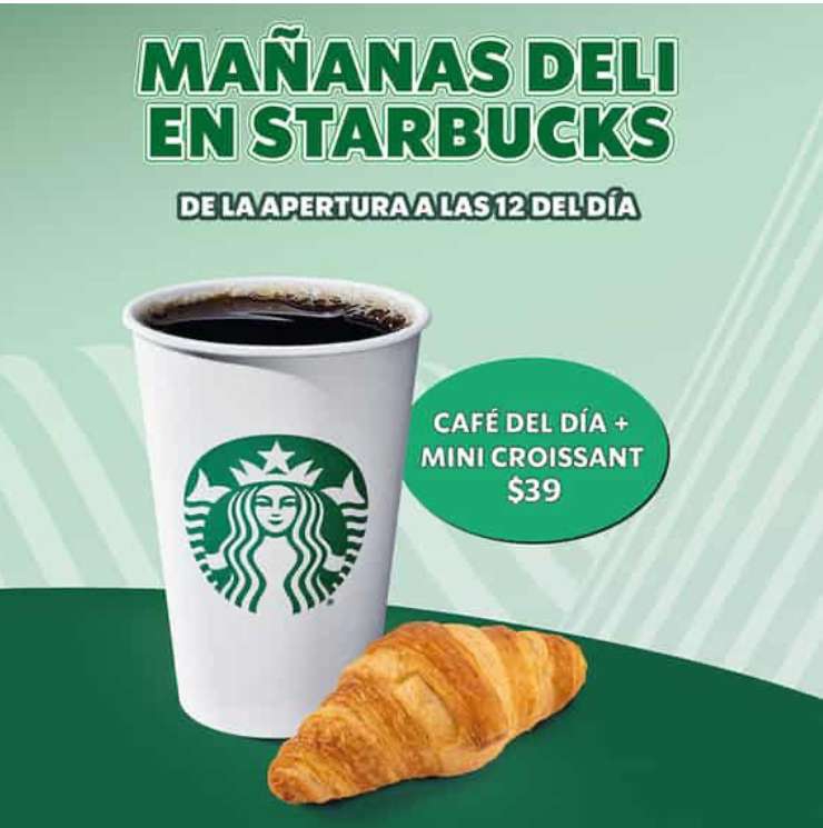 Starbucks Ir a la ofertaCafé del día alto (300 mL) frio o caliente, más un *mini croissant mantequilla por $39. Válido del 8 de enero al 25 de febrero de 2024. De apertura de tienda a 12:00pm. La bebida no incluye modificadores, éstos se cobran a precio de lista. *Los croissants participantes son: Croissant core y Croissant horneado en tienda. Pide la promoción a tu barista al ordenar. Válido en tiendas Starbucks Coffee de la República Mexicana. Ordena en Tienda, Pickup (recoge en tienda), Car Pickup (recoge en tú auto) y Drive Thru.