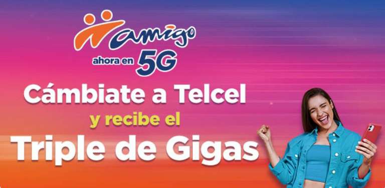 Telcel Ir a la ofertaCámbiate a Amigo de Telcel con la tarifa Amigo Sin Límite, realiza recargas iguales o mayores a $50 que activen un Paquete Amigo Sin Límite y por promoción durante los primeros 6 meses recibe el Triple de Gigas.