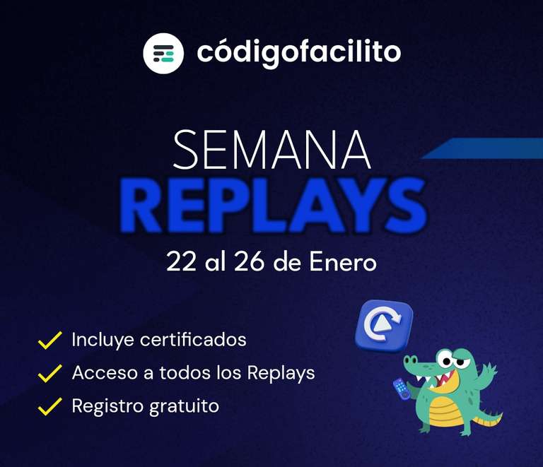 Ir a la ofertaCódigo facilito tendrá semana de bootcamps libre, solo te registras y podrás acceder a todos sus bootcamps grabados. Si terminas alguno podrás obtener el certificado sin costo