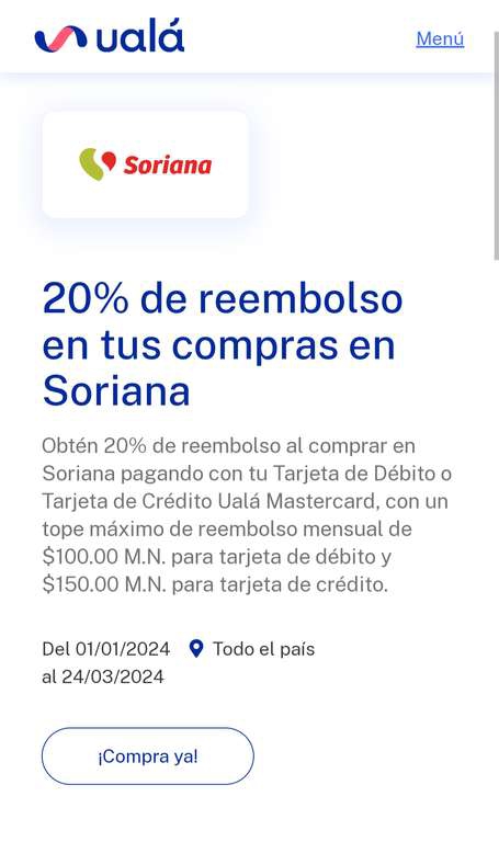 Ir a la oferta20% de reembolso en Soriana pagando con tarjetas de débito y crédito Ualá. Tope maximo de reembolso mensual de $100 para débito y $150 para crédito.