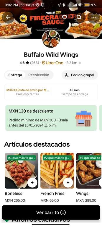 Utilizando el descuento por ser Uber One queda en ese precio. Visto en Buffalo Wings Interlomas
