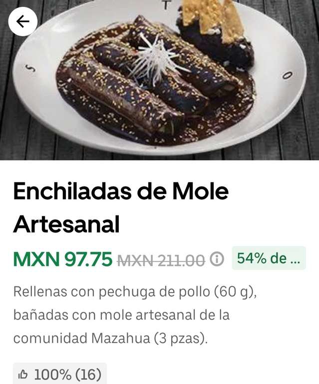 Aplica seleccionando 2 órdenes de echiladas de mole con 54% de descuento ➕ promoción de $140 de ahorro en la compra de $400