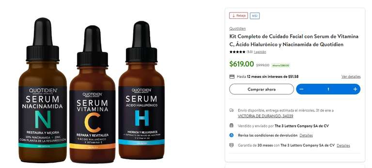 Walmart Ir a la ofertaEn la pagina oficial cuesta $999, pero si lo compras en walmart sale más barato a comparación de cualquier otra tienda. En Amazon y Mercado Libre están en $600 pero sin Niacinamida por lo que es muy buena opción.