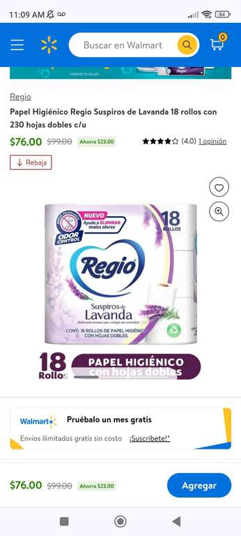 Walmart Ir a la ofertaEssity tiene bonificación de $60 pesos compra mínima $300, un ejemplo es comprando 4 paquetes de regio lavanda, te queda en $61 pesos cada paquete