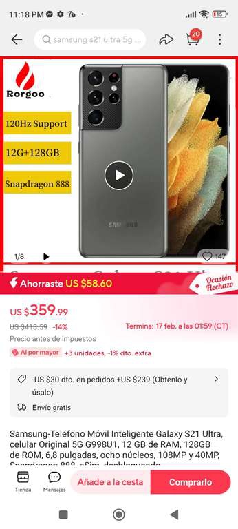 AliExpress: Combo Celular Samsung Galaxy S21 Ultra Reacondicionado + funda de privacidad | Pagando en USD