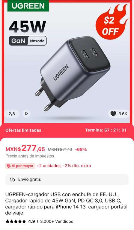 AliExpress Ir a la ofertaEl precio se obtiene desde la sección Super Ofertas, preciazo para este cargador GAN, tengo varios Ugreen y son garantía.