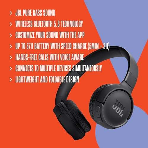 Amazon JBL Tune 520BT - Bluetooth 5.3 - Batería de 57 horas - Carga TURBO - Sonido de graves puros - Negro