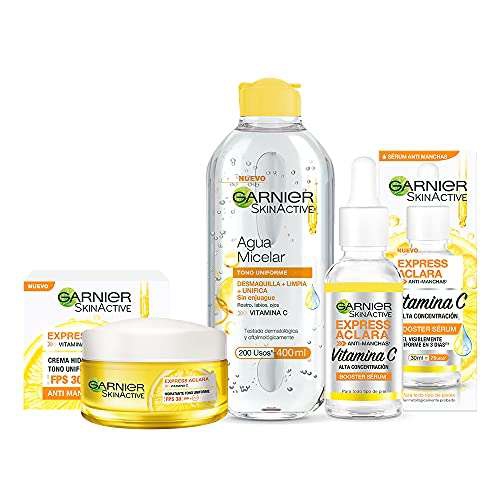Amazon Ir a la oferta- ¿Manchas en tu cara? Descubre la rutina anti manchas de Garnier Express Aclara con este nuevo kit que contiene: un agua micelar, un booster sérum anti manchas y una crema hidratante tono uniforme con FPS 30.