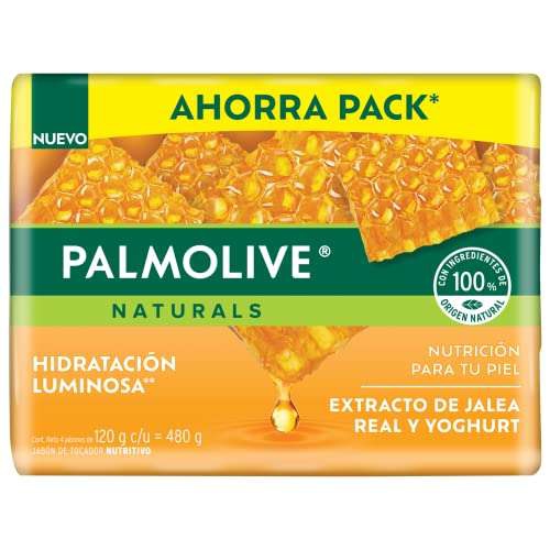 Amazon Ir a la ofertaJabón en Barra Palmolive Naturals, Hidratación Luminosa,Extracto de Jalea Real y Yoghurt, 4x120gr, paquete de 480g