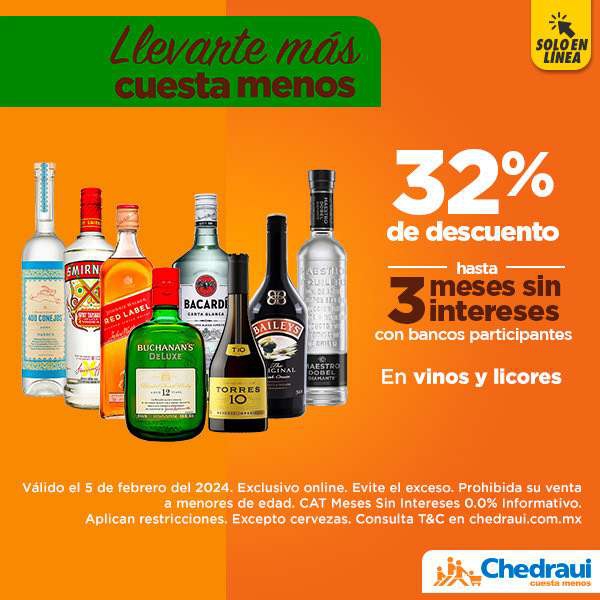 Chedraui Ir a la ofertaSolo éste 5 de febrero, los vinos y licores en Chedraui tienen un 32% de descuento y hasta 3 meses sin intereses con bancos participantes.