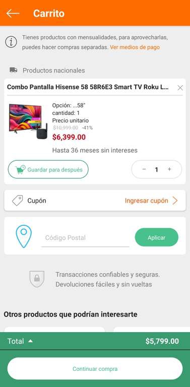 Combo pantalla repetidora Linio Hisense 58" pagando con paypal