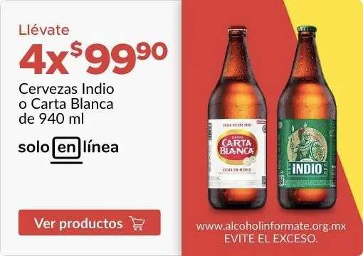 Cuatro caguamas Indio o Carta Blanca por $99 en Soriana (exclusivo online)