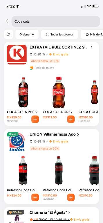 DiDi FoodDidi Food. Descuento del 50% en botanas y coca colas en diferentes presentación. Disponible en circle k y farmacias unión.