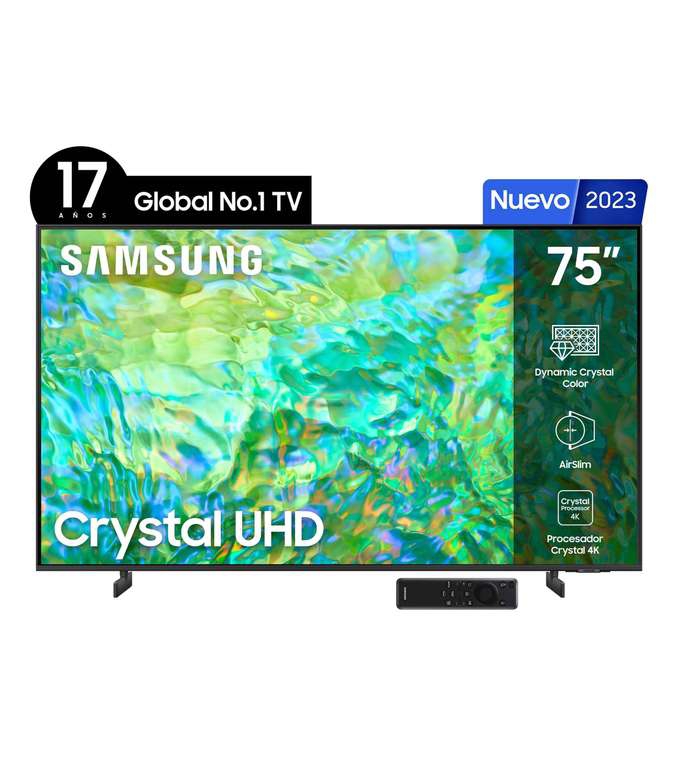 El Palacio de Hierro Ir a la ofertaPantalla Samsung 75 Pulgadas Plana Crystal UHD 4K UN75CU8000FXZX; Dynamic Crystal Color. Colores en su máxima expresión. Descubre un nuevo nivel de UHD con tecnología avanzada mientras te sumerges en la imagen con mil millones de matices de color. Disfruta cada sutileza en las imágenes gracias a las variaciones realistas del Dynamic Crystal Color. Q Symphony & OTS Lite: Lleva el sonido cinematográfico a casa. Siente los movimientos de cada escena con los ojos y los oídos al mismo tiempo con el sonido que sale hacia todas direcciones desde los dos altavoces virtuales de la parte superior de la pantalla mientras que su Adaptive Sound+ analiza las escenas en tiempo real y proporciona el sonido óptimo para cada escena, maximizando la inmersión de todos los contenidos. Con Q-Symphony, podrás incrementar la experiencia de una barra de sonido Samsung, utilizándola simultáneamente con los altavoces del televisor para un sonido envolvente.