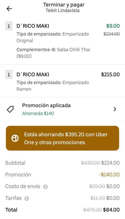 Uber EatsTeikit Lindavista (CDMX) tiene 2x1 en algunos sushi, entre ellos D' Riko Maki, a uno se le agrega un complemento de $9 pesos para acumular el mínimo para el descuento adicional de $140