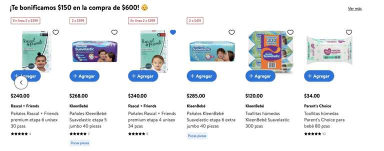 Walmart Ir a la ofertaProductos para bebe con descuento automático de 150 al llegar a los 600 pesos, si tienen Walmart Pass se ahorran los 44 de envío.