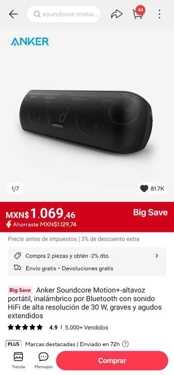 AliExpress Ir a la ofertaBocina Anker Soundcore motion+ en el precio más bajo que he visto sin cupones adicionales. El precio final se consigue con un pequeño descuento que te hacen con monedas.