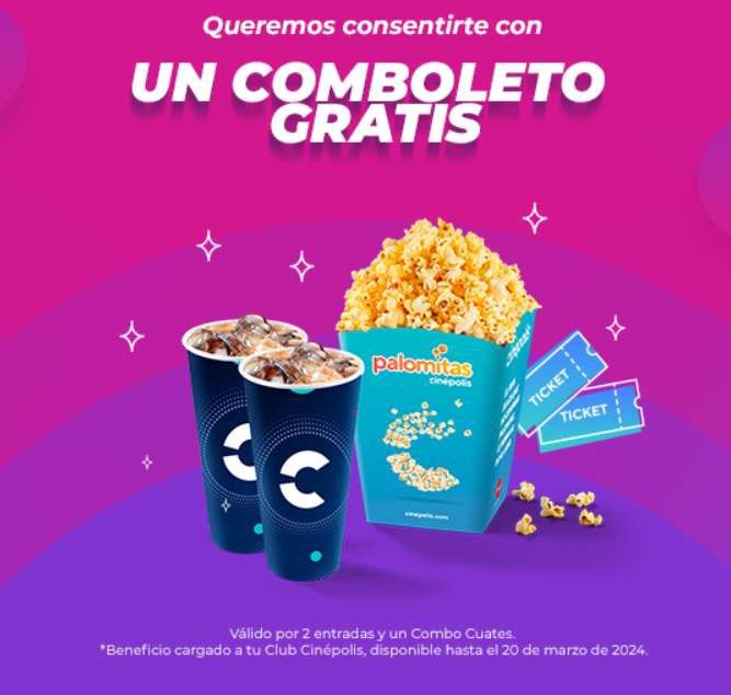 Comboleto gratis: Beneficio cargado a la Club Cinépolis. Vigencia al 20 de marzo de 2024. Para redimir el beneficio, es necesario en taquilla elegir la función para obtener los boletos, posteriormente pasar a dulcería a redimir el combo. Válido por 2 entradas y un Combo Cuates gratis. Las entradas son válidas en las taquillas o app de los conjuntos Cinépolis® de la República Mexicana. Válido únicamente en Salas Tradicionales. No aplica en Cinépolis VIP®, MacroXE®, 4DX®, IMAX®, PLUUS®, Sala Junior Cinépolis® ni 3D. No aplica en premieres, funciones especiales, festivales o contenido alternativo. No aplica en reservaciones por Cineticket, venta avanzada, taquilla automática o cualquier otro medio no especificado. No aplica con otras promociones, precios preferenciales y no es acumulable. Esta promoción no aplica en días festivos y de descanso obligatorio señalados en la Ley Federal del Trabajo. Las entradas deben ser para la misma función y formato exhibidas el día de la compra. Sujeto a disponibilidad o cupo en la sala. El Combo Cuates incluye 2 refrescos jumbo (1.2 L.) de cualquier sabor y una canasta de palomitas jumbo sabor mantequilla (215 gr.). Las cantidades son aproximadas. El cambio de sabor en palomitas se cobra por separado. Válido en los conjuntos Cinépolis® de la República Mexicana. No aplica en Cinépolis VIP®. Producto sujeto a disponibilidad. El precio es en moneda nacional e incluye IVA. No participa con otras promociones o descuentos. Prohibida su venta. La responsabilidad de hacer efectiva la promoción es única y exclusiva de Cinépolis.