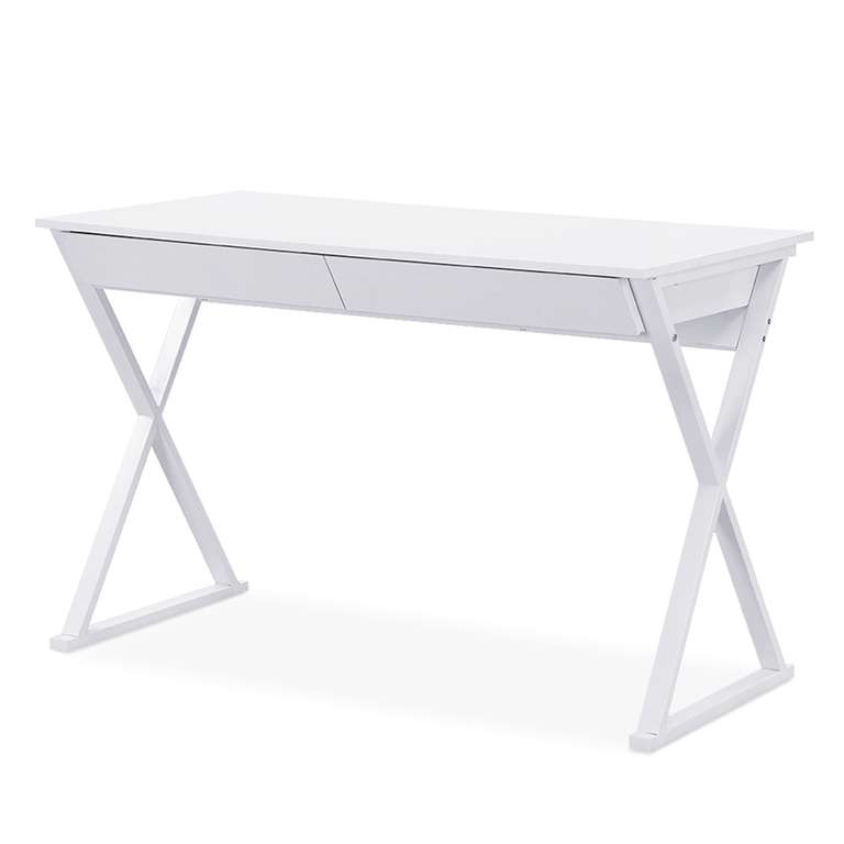 Especificaciones: Escritorio blanco con estructura de metal resistente / Con dos cajones para almacenaje / Amplio panel para trabajar