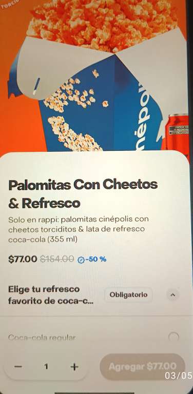 Rappi Ir a la ofertaPalomitas con cheetos & refreso $77