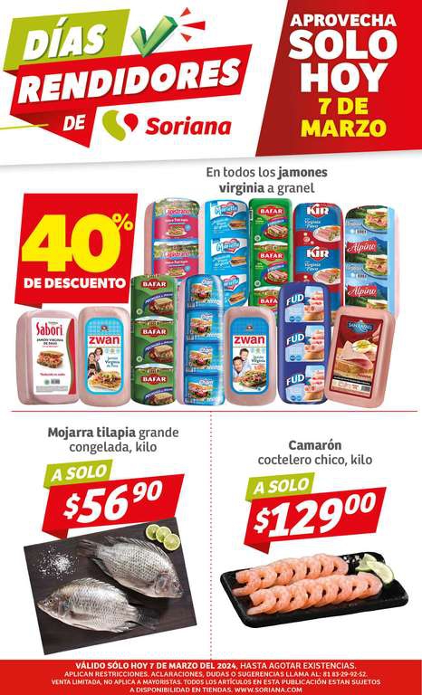Soriana: Días Rendidores 7 Marzo: 40% de descuento en jamones virginia a granel • 35% de descuento en pantalones de mezclilla