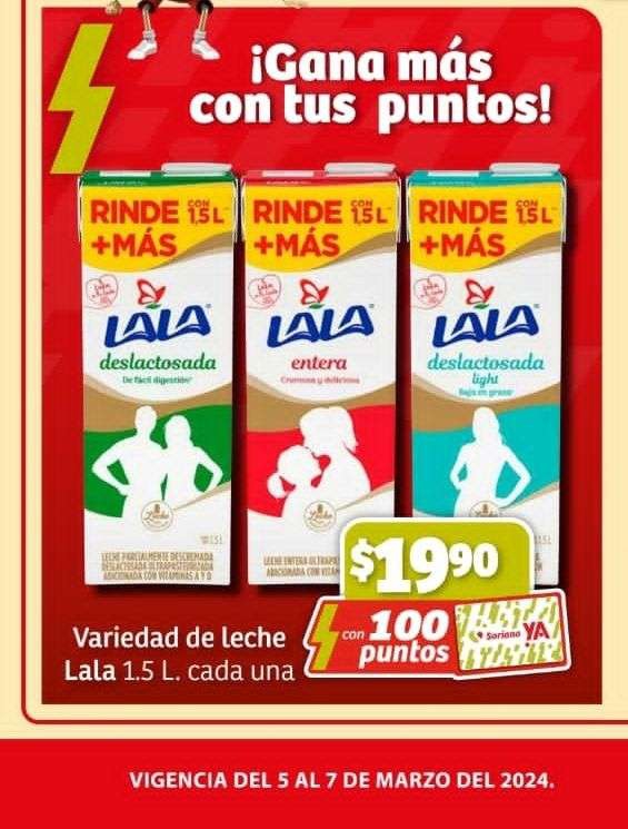 Soriana: Leche lala de 1.5 con 100 puntos con tarjeta soriana