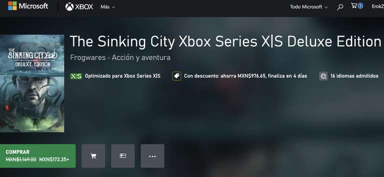 Xbox Ir a la ofertaMejora tu experiencia con la Edición Deluxe, que incluye:- The Sinking City®- Adoradores del Necronomicón- La misericordia de la locura- Paquete de detective- La revientaórganos de Chicago- Extra de experiencia.The Sinking City® en Xbox Series X|S goza de las siguiente mejoras:- 60 fotogramas por segundo.- Fidelidad visual mejorada.- Tiempos de carga significativamente más rápidos.- Nuevas misiones.- DLC Merciful Madness (incluido en la Edición Deluxe, o como compra por separado).The Sinking City es un juego de aventura e investigación de mundo abierto inspirado en el universo de H. P. Lovecraft, el maestro del terror. La ciudad semisumergida de Oakmont es presa de fuerzas sobrenaturales. Eres un investigador privado y debes averiguar qué ha poseído la ciudad... y la mente de sus habitantes.